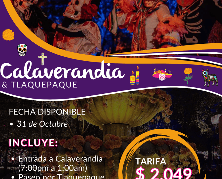 📍 Vive el Día de Muertos como nunca. En Calaveralandia, Guadalajara te esperan espectáculos, altares y atracciones llenas de magia. Antes, disfruta el encanto de Tlaquepaque, un Pueblo Mágico de arte y tradición.